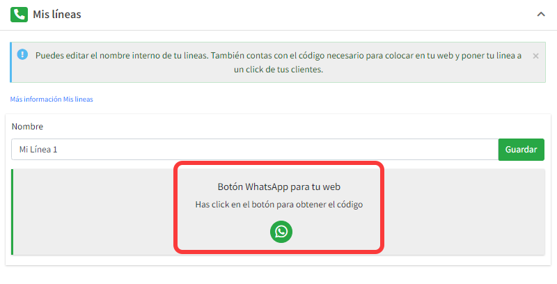3)  Hacé click en Botón WhatsApp para tu web” para obtener el código. Este es el código que deberás insertar en tu web para que aparezca el botón de contacto en tu sitio.