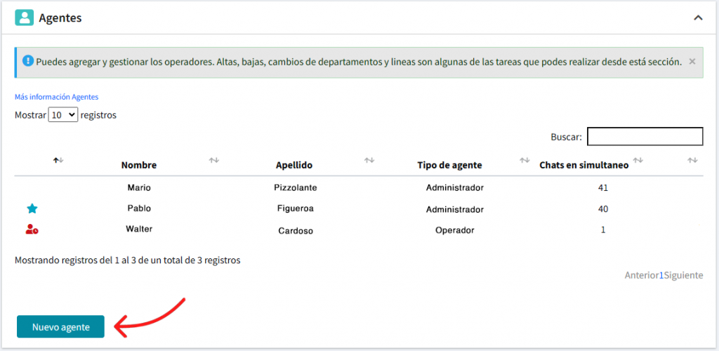 En esta sección verás cómo agregar, modificar, eliminar, asignar roles y establecer la cantidad máxima de chats para cada operador de tu empresa. Tené en cuenta que solamente los usuarios con privilegios de administrador pueden hacer estas modificaciones.