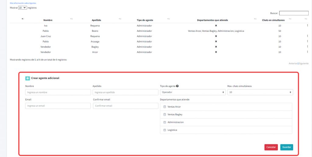 Podrás también configurar la cantidad máxima de chats en simultáneo que puede tener ese agente, y a qué departamentos pertenece.