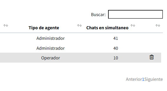 – Para eliminar un agente, posicioná el mouse sobre su nombre en la lista y aparecerá un ícono de papelera de reciclaje. Hacé click en el ícono para eliminar el agente: