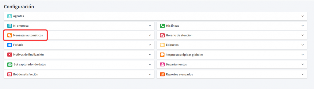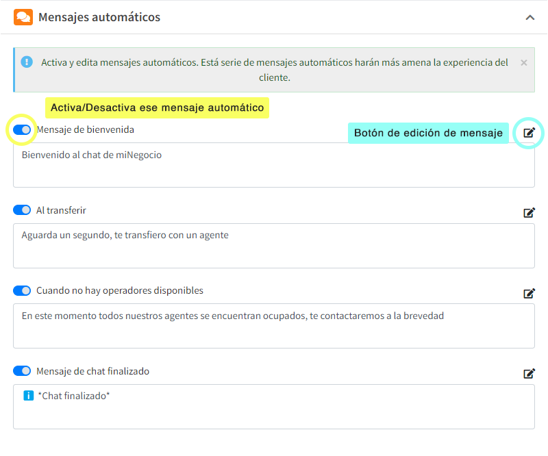 En la sección Mensajes automáticos podrá activar y/o editar los mensajes automáticos disponibles para cada situación del chat.