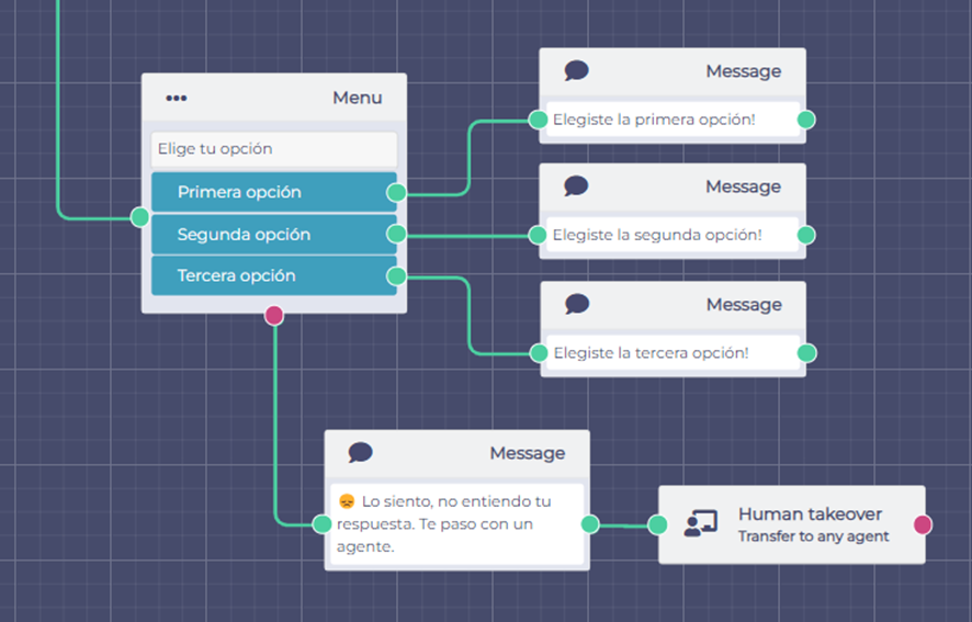 Si el usuario contestara de manera incorrecta 3 veces, el flujo continuará por la salida roja de la box. En tal caso, se recomienda pasar el chat a un agente humano, conectando con la box Human takeover, o bien, dar por finalizado el chat, conectando con la box Finish chat session.