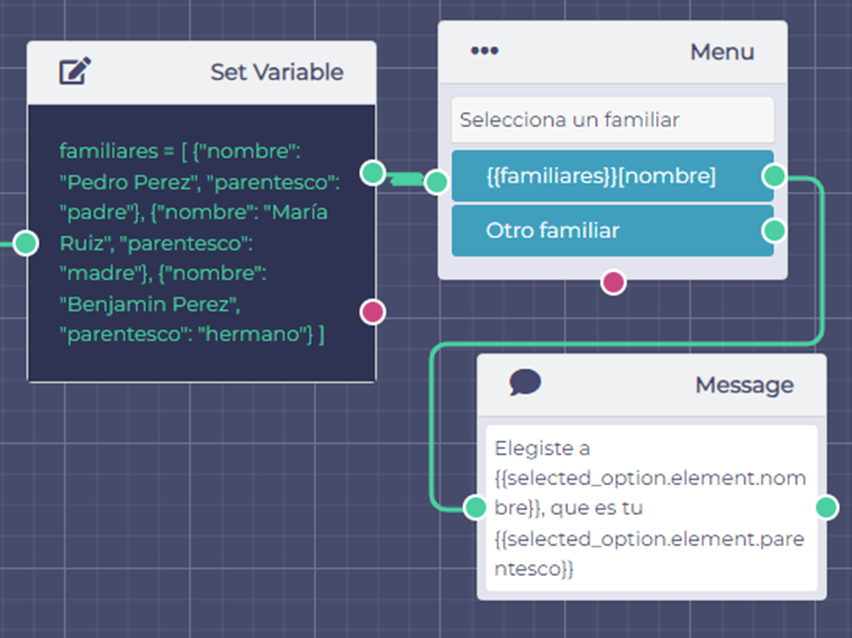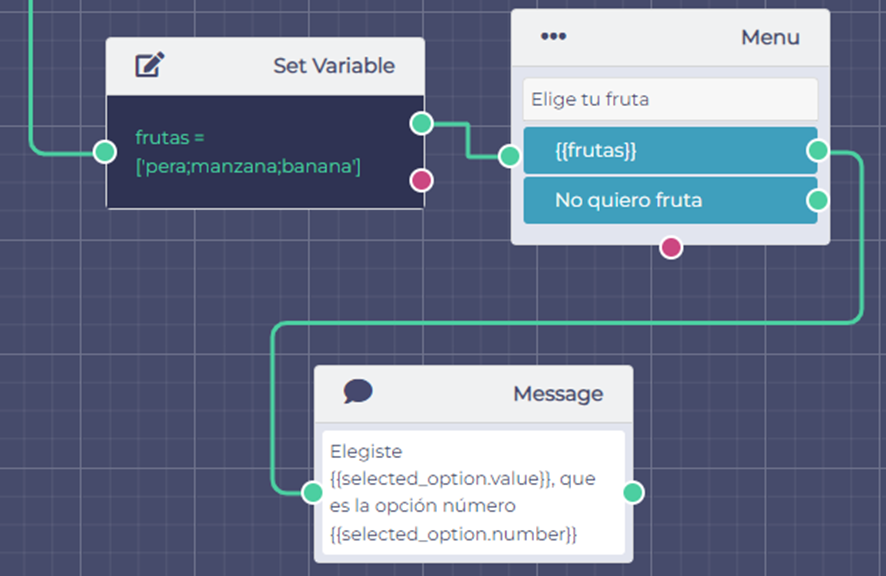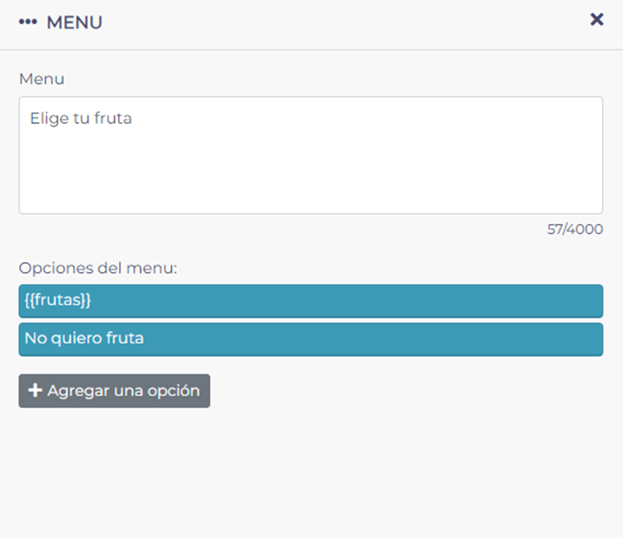 Puedes generar las opciones de un menú de manera automática utilizando un array. Esto significa que se creará una opción del menú por cada elemento de ese array. Para ello deberás ingresar el nombre del array encerrado en doble llave, ej.: {{frutas}}, en campo de las opciones del menú.