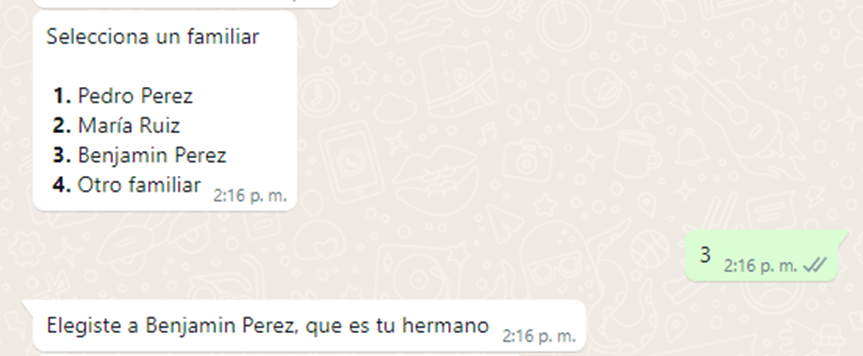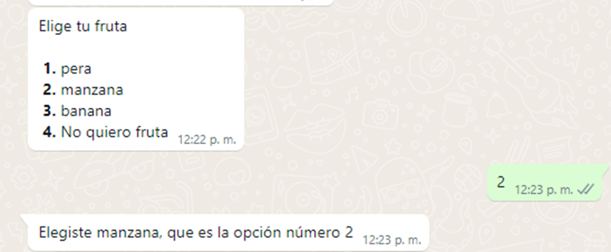 En caso de que el usuario responda un valor incorrecto, como por ejemplo un número mayor a la cantidad de opciones disponibles, o un texto no numérico, o un audio, etc., el bot le enviará un mensaje informando que la respuesta ha sido incorrecta y le dará una pista respecto a cómo tiene que contestar: Ej.: “Respuesta incorrecta. Se espera un número entre 1 y 4” y a continuación enviará nuevamente el mensaje que contiene el menú.