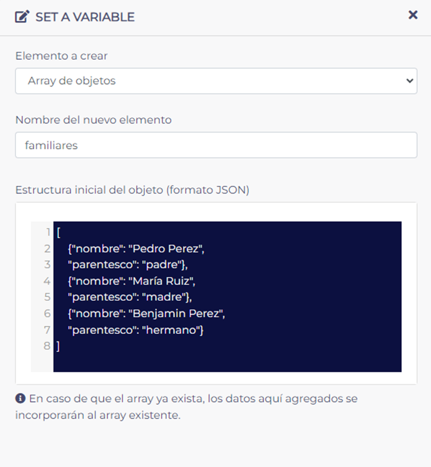 Se trata de un array de objetos, porque cada elemento del array es un objeto. En este caso, el array tiene 3 elementos, y cada uno de ellos tiene dos propiedades: nombre y parentesco.