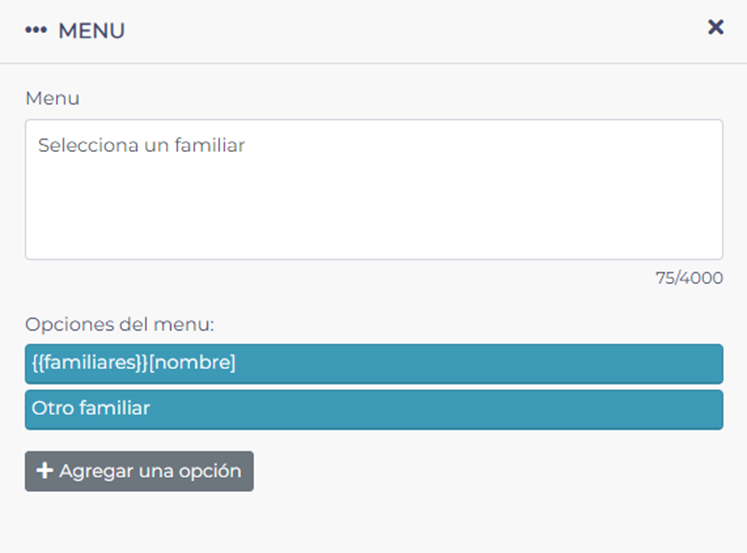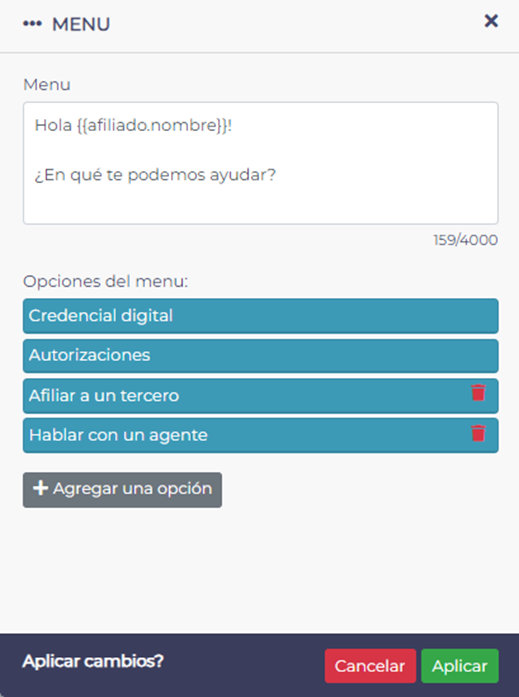 Puedes definir el texto inicial del menú, que podría ser en forma de pregunta, para orientar mejor al usuario, escribiendo en el cuadro de texto blanco. Puedes utilizar variables para enriquecer el contenido del texto inicial y/o alguna de las opciones.