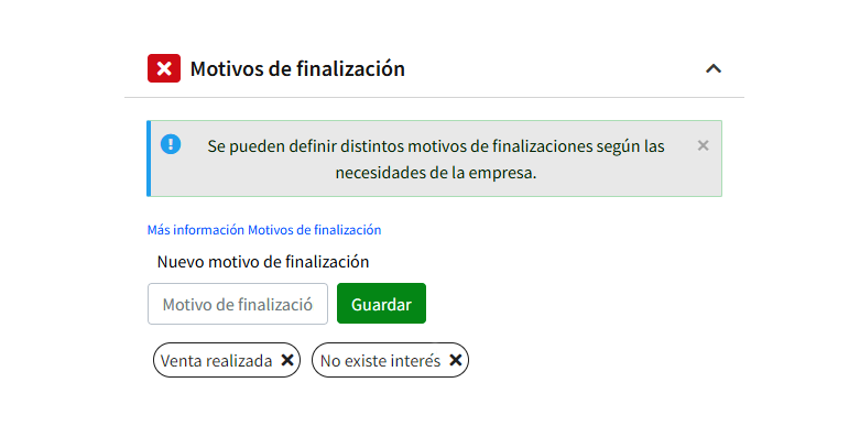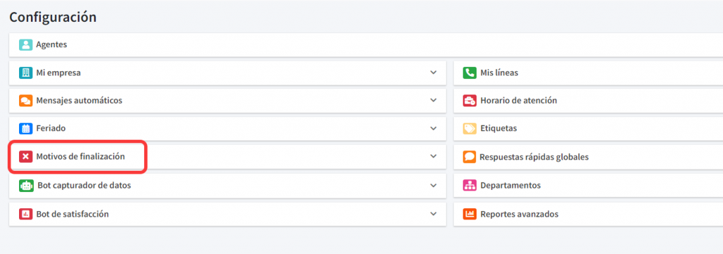 Las conversaciones con los clientes pueden finalizarse por distintos motivos: podría ser porque un cliente ya no quiere hacer una compra, porque realizó la compra via web o por cualquier otro motivo. Keego Chat te permite crear motivos de finalización que se adaptar a tus necesidades, para que tengas registro de por qué se terminó una conversación determinada. Te mostramos cómo configurarlos: